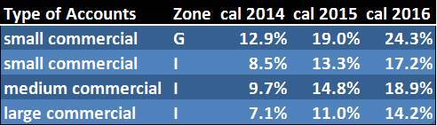 To give you an idea of the effect of these changes in capacity prices on the overall cost of electricity, we re-analyzed a sample of accounts in our database. Below, we show the changes in a full requirements fixed price for each of the next three calendar years. These fixed price estimates are based on the current forward market for energy and our best estimate of future costs (such as ancillary services, etc). Each of the sample accounts have different mixes of load profiles and load factor. Here we define load factor as the relationship between annual energy and the current ICap obligation (the “ICap Tag”). The percentage changes are relative to a full requirements rate using 100% rest-of-state ICap costs as if the new zone did not exist.