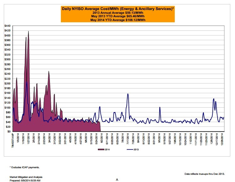 May 2014 average year-to-date monthly cost of $108.12/MWh is a 65% increase from $65.46/MWh in May 2013.