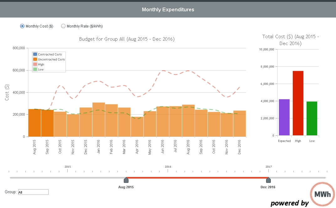 Quick explanation of this budget forecast graph: The Budget graph shows actual realized costs for past months as well as a forecast of costs over the next 3 years. The dotted lines on the main bar graph depict the historical high and low costs for the forecasted period. The bar graph to the right shows the total expected, high and low costs for the entire period. This information has been informed by an expert view on the variability of something nobody controls: market prices!