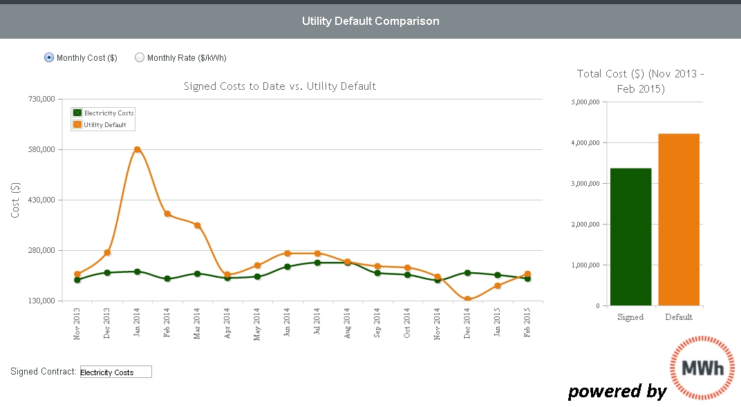 Quick explanation of this benchmarking graph: Here’s a picture of how your contracts are performing vs. the utility default rate. The so-called default rate is the name for what you would have paid the utility if you had not opted to use a third party supplier. In some markets, this is known as the “price-to-compare”. Note that this isn’t the only useful benchmark that a well-armed energy manager can use to gauge performance.