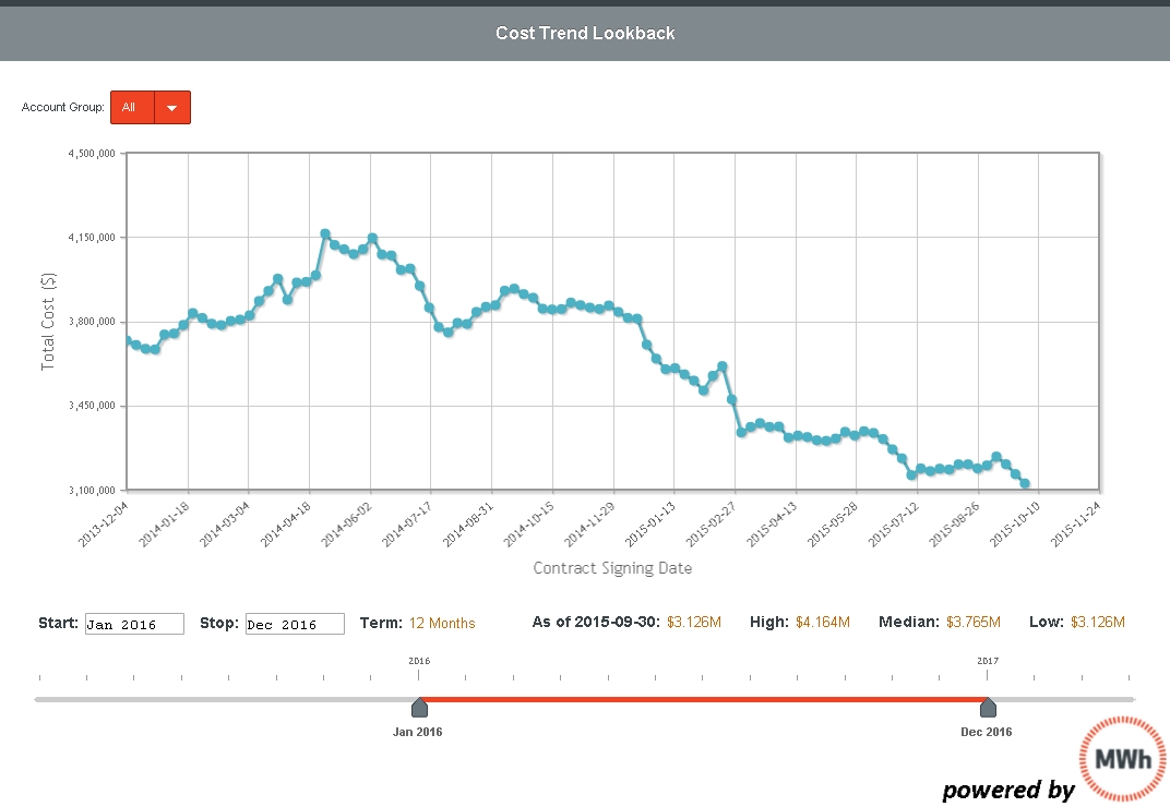 Quick explanation of this trend graph: The Cost Trend graph shows how total contract costs have moved over time based on changes in power markets, major usage changes (i.e. a significant change in capacity obligation, for example) or changes in other market prices. This information gives you a context for a decision at a given point-in-time. How do today’s prices compare to historical rates? What’s the impact of those changes?