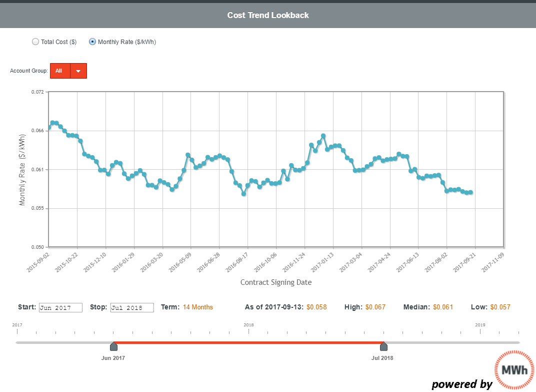 - MWh’s cost trend graph shows the customer how the price that they’re seeing in the market today for a set term compares to historical pricing. That information gives customers confidence that they are buying during the right trend. And that they are probably not leaving a lot of value on the table. You can see an example of the cost trend look back, below. You can see how the unit rate for the same contract term (June 2017-July 2018) has changed over time. The trend in this graph is headed in the right direction for a customer interested in making a purchase, and current prices are as low or lower than the recent prices.