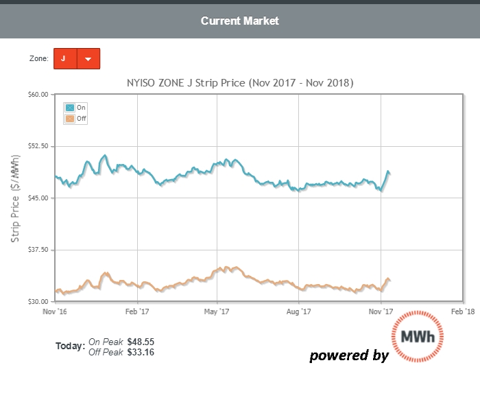 This graph appears on MWh’s dashboard. The horizontal axis represents time from (in this case) November 2017 – November 2018. The vertical axis represents wholesale on and off peak power costs in $/MWh. This graph represents the way that a 12 month “strip” of wholesale power has changed between last November and this November. So each spot on the curve represents the wholesale on peak (blue) or off peak (orange) average cost of energy for the next 12 months. On this graph, you can think of the “curve” part of the forward curve as the lines you see here connecting a series of fixed (i.e. known, established, agreed-upon) prices for exchange (purchase or sale) of power for Nov ’17 through Nov ’18. The graph is essentially a curve of the curve– showing how those forward prices have changed and moved over time. These lines represent a schedule of fixed prices that you can rely on for future purchases or sales of the asset – hence “forward.”