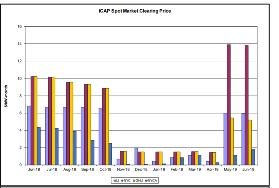 Capacity costs have also been low across the State of NY for several years. In the Fall of 2018, however, NYC summer capacity prices in the forward market increased from $8/kW month to $14/kW month, almost doubling  prior year prices. See the graph below, published by the NY Independent System Operator (ISO) for a record of spot market clearing prices from June 2018 through June 2019 across the state. Note that NYC market clearing prices have increased over the past few months while capacity costs elsewhere have declined.