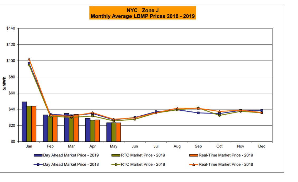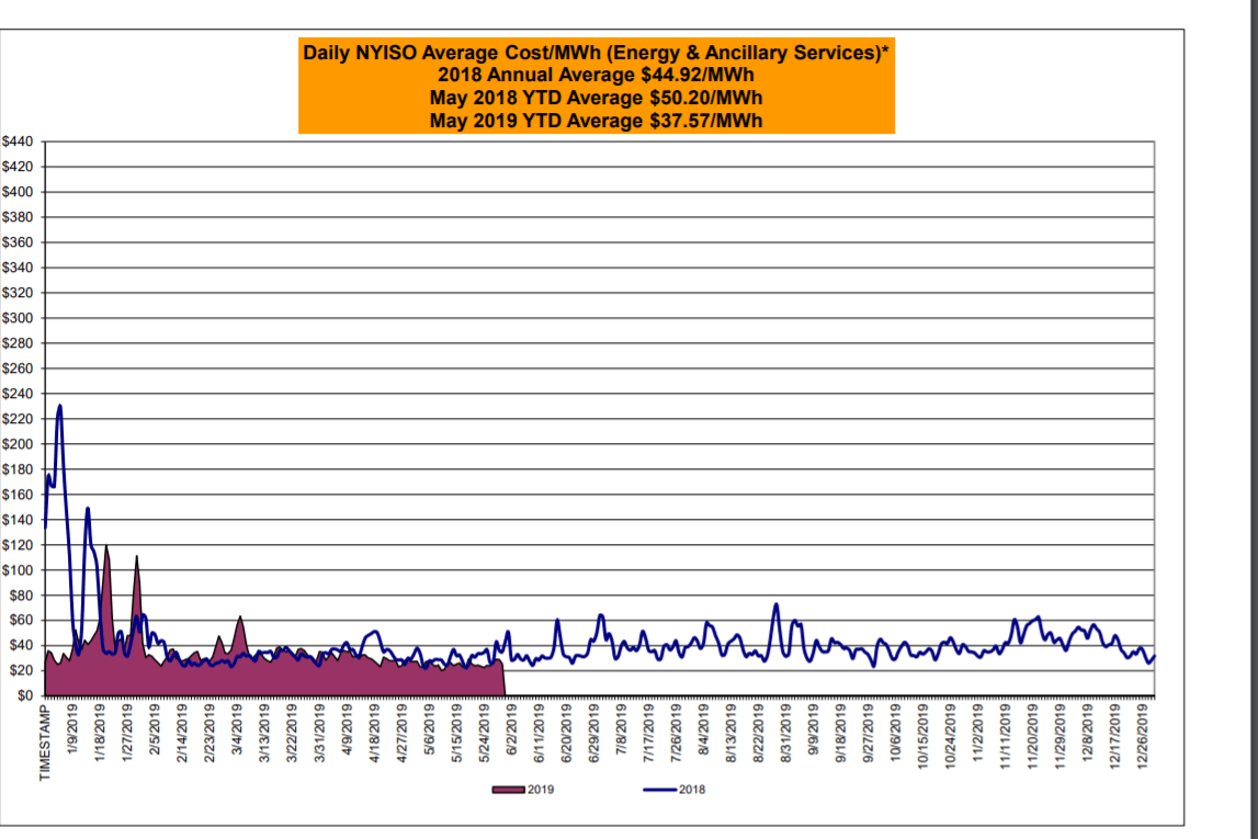 Day ahead markets across the state were lower through May 2019 (purple graph- YTD average $37.57) compared to May 2018 (blue line 2018 to-date avg $50.20). Customers who have either index exposure or who have chosen to remain with their utility for supply in NY will have paid the day ahead index price. Note that while index prices have been low during this calendar year, any customer who chooses to receive index energy will not be able to ensure budget certainty. For example, index prices in January 2018 were high and volatile. In January 2018, index energy customers would have paid as much as $220/MWh and their budgets could been significantly impacted by these power rates.