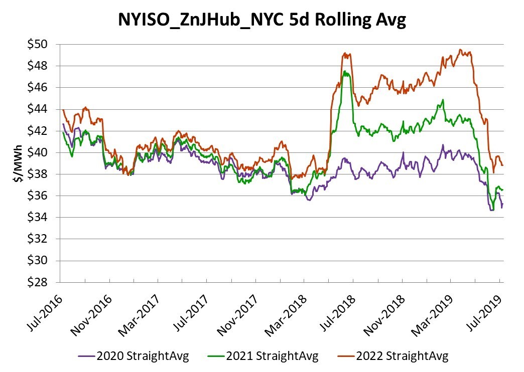 A comparison of forward power market price movement for the next several years demonstrates the volatility we’re describing. The average forward price in Zone J dropped as much as $14/MWh over the past few weeks.