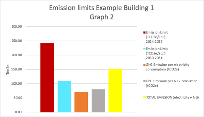 We used sample data for the information that appears in Graph 2. As you can see from this graph, this sample building will be below the limit for the first period (2024-2029). However, the building will need to put additional measures in place to prepare and comply with building emission limits during the second period (2030-2034). MWh’s initial analysis suggests that most NYC buildings will be in a position to comply with the first period limits. Buildings with significant cogeneration facilities may be an exception to this rule. The second period will present more of a compliance challenge for Tenants and Owners.