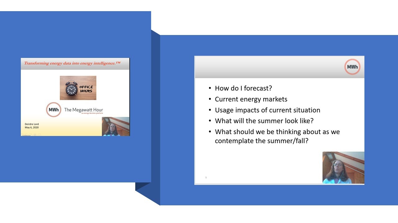 Description: Join The Megawatt Hour for informal questions and answers regarding your energy usage, costs and requirements. We will be focusing this week on ways that customers can lower their costs over the next 6, 9 and 12 months.