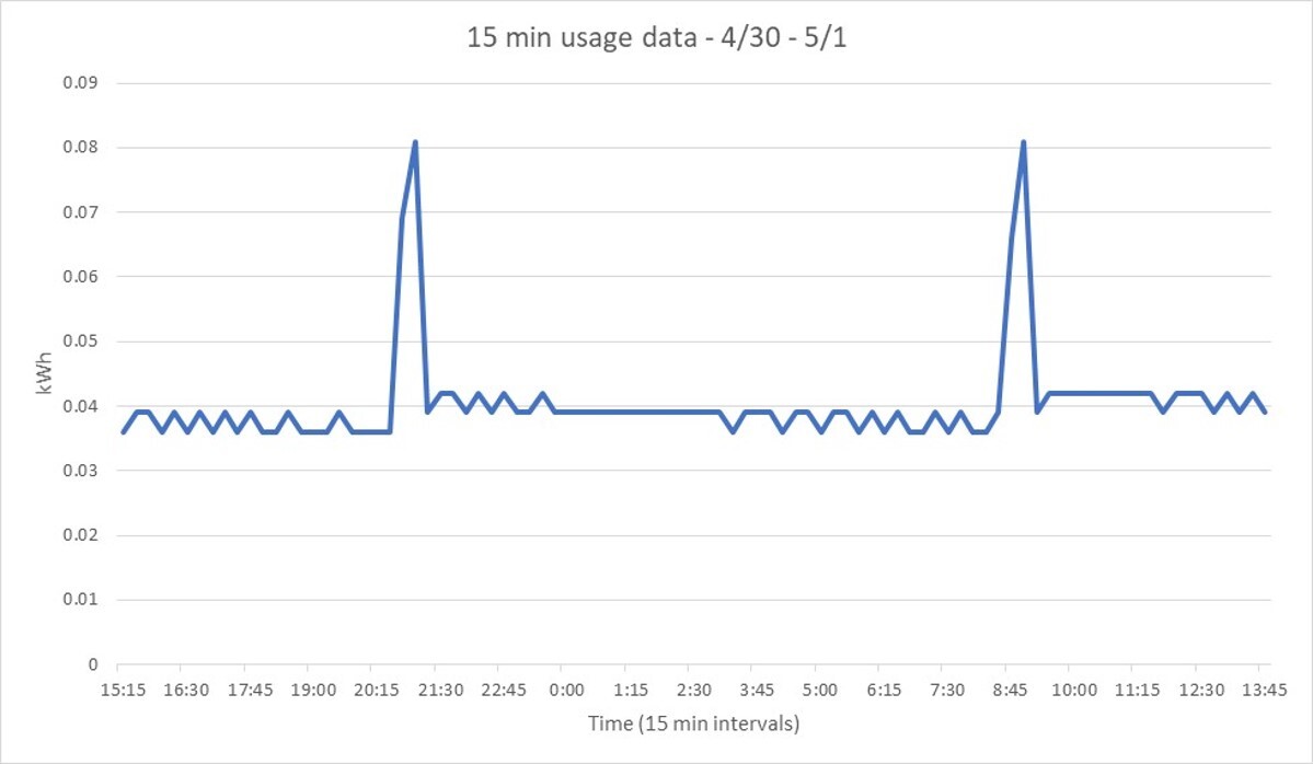 I have to confess that even for a person who makes a living navigating usage, data and analytics, it was not entirely straight forward to get the interval data for my apartment from Con Ed. Nevertheless, I was able download 24 hours of 15 minute data for April 30 at 3:15pm to May 1 at 2:45pm. This is what I found:
