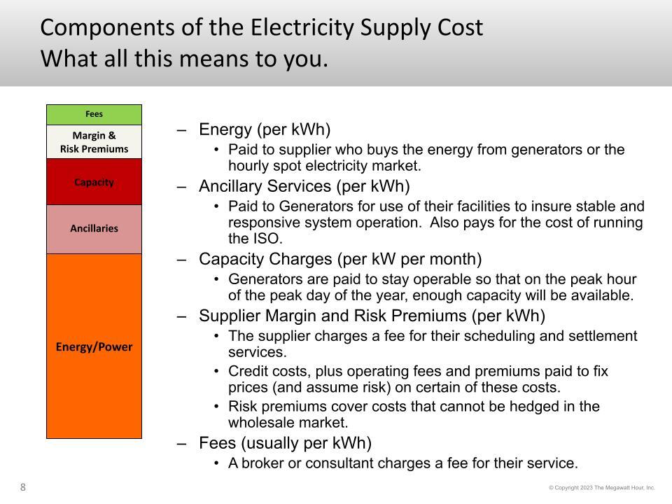 The first and largest component of cost is the energy cost. This cost, to be a bit technical, is the ISO load zone cost that includes everything needed to generate the power and move it through the ISO high-voltage transmission system to the area where your load is situated. Customers pay suppliers for Energy in units of kilowatt hours or kWh ($/kWh).