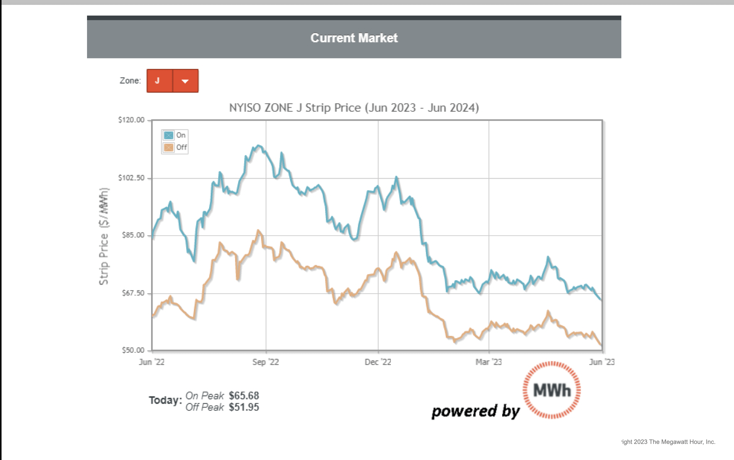 On the far left side of the graph you can see what you would have paid if you bought power for June 2023-June 2024 a year ago (which you can do, by the way). A year ago, you would have paid $85/MWh for on-peak power. If you bought in Sept ‘22, you would have paid over $110/MWh. But if you bought more recently, you would have paid $65-$67/MWh. That’s a swing of 40% in a few short months.