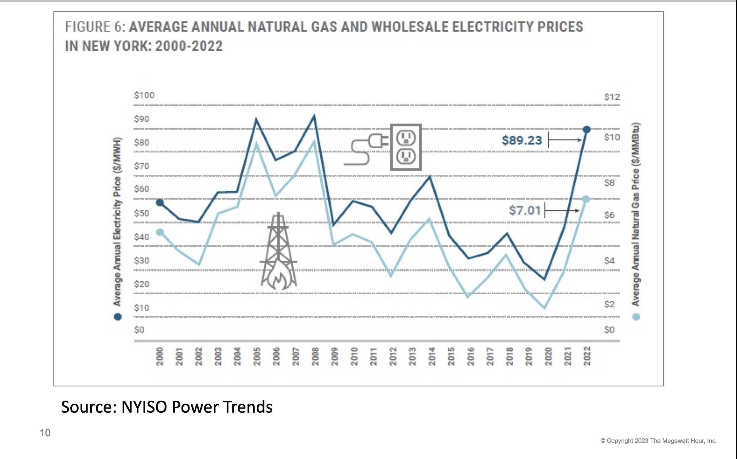 Most of this variability is driven by changes in gas markets. As you will notice from the graphic below natural gas is the underlying fuel for electricity generation which typically sets the marginal price for power in NY State and in many markets. When gas prices are high or volatile, so are power prices. However, we are transitioning away from fossil fuel driven power generation… so we don’t know what will set the marginal cost of power in the future. That uncertainty will likely contribute to continued volatility in markets in the next decade or so… Throughout the grid transition, we expect continued volatility and the potential for significant changes in energy costs. So, it is especially important to pay attention to market dynamics.