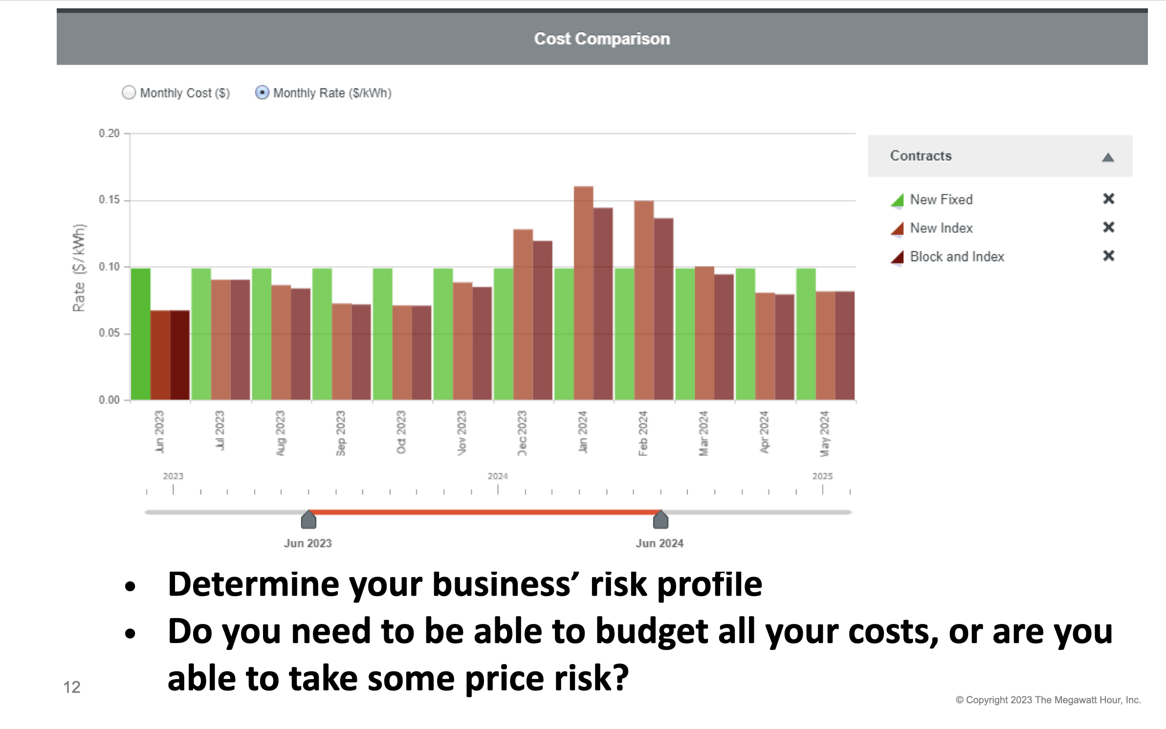 The following graph compares the monthly unit rate for 3 different energy products: a fixed price, in green, an index, in dark red or a hybrid of these two options: The index with a block of power. You need to determine what matters most to you as an organization. Then you need to be actively engaged in purchasing to make sure your purchasing strategy matches your institution’s goals: Do you prioritize budget certainty over cost? Are you willing to take some risk and let some parts of your cost float on an index? This is one of the most important conversations you can have as an organization. We would recommend that you revisit the strategy conversation regularly as markets evolve.