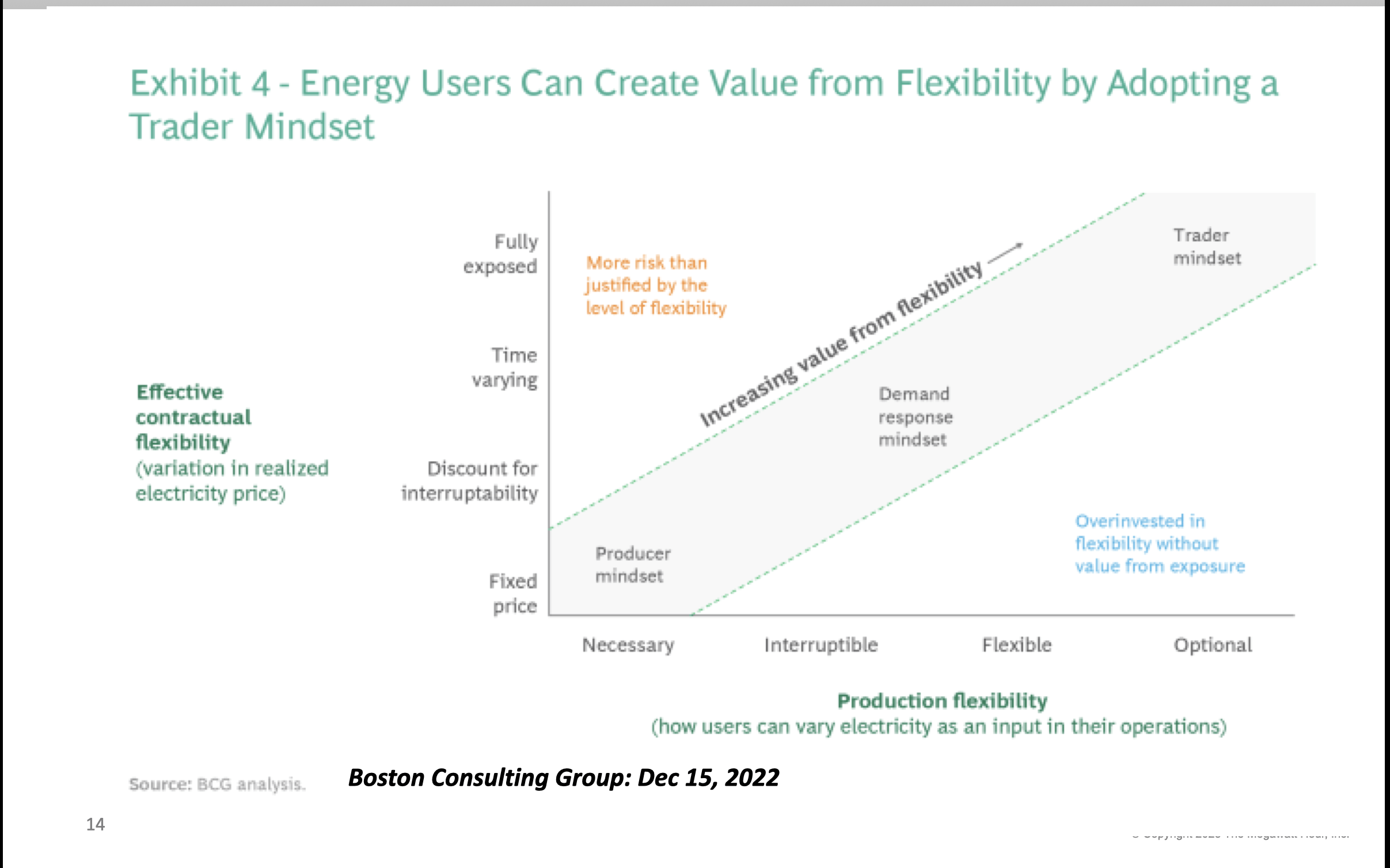The following graphic is drawn from a Boston Consulting Group article titled “What CEO’s Can Learn from Energy Traders”, largely in response to volatility in energy markets. The article recommends, to the extent possible, introducing as much market-responsive flexibility as possible into an organization. Think of your operation as being integrated with markets and make sure, to the extent possible, you are able to respond to market changes and volatility. That is typically easier to do for a manufacturing facility, for example. But there are ways to build greater flexibility into your operation no matter what your business. Adopt a trader mindset as we transition to a different grid. Customers benefit from becoming more flexible in responding to price signals and shifting operations rather than being entirely price takers.