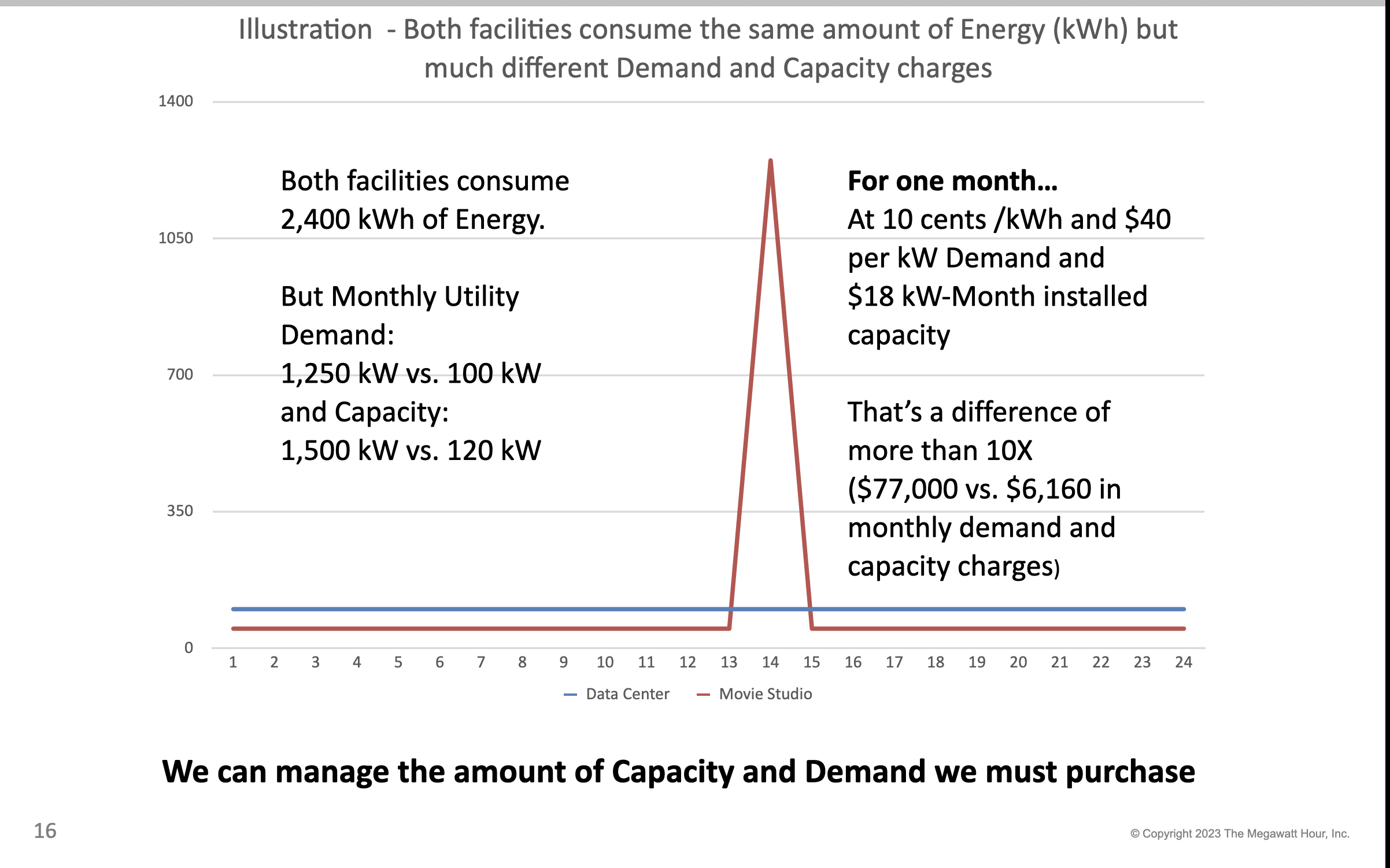 Reducing load during peak periods can decrease demand charges and overall energy consumption. Large energy users who participate in these programs can also receive payments for reducing their electricity usage during peak hours. Managing demand and capacity during peak periods can be an important and lucrative undertaking, as you can see from the following graphic. Two customers (in this case a movie studio, in red, and a data center, in blue) can have the same kWh usage with dramatically different kW peak demand. Both facilities consume 2,400 kWh of energy on a single day. Monthly utility demand reaches 1,250 kW for the movie studio when they’re producing a film vs. 100 kW for the data center. Capacity is a similar story: 1,500 kW vs. 120 kW. For one month at 10 cents /kWh and $40 per kW Demand and $18 kW-Month Installed Capacity (ICAP), that’s a difference of more than 10X ($77,000 vs. $6,160 in monthly demand and capacity charges).