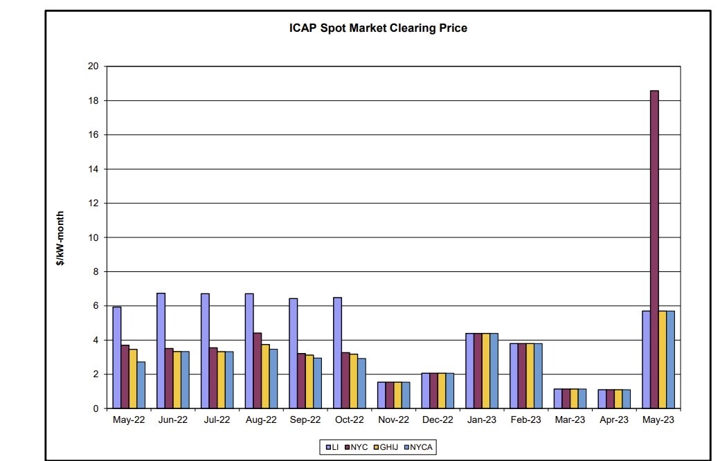 As we noted in our article “What to know about energy markets” and during our recent Webinar, energy markets are the most volatile we’ve seen in over a decade. Both energy and capacity markets have grown more dynamic and volatile as you can tell from May-23 in the figure ICAP Spot Market Clearing Price. While we can point to some factors driving this volatility, it is nearly impossible to predict how the market will look in the future. What is clear, however, is that as we phase out natural gas and fossil fuels, it is even more important to pay attention to energy markets and to pay attention to the dynamics of the energy transition.