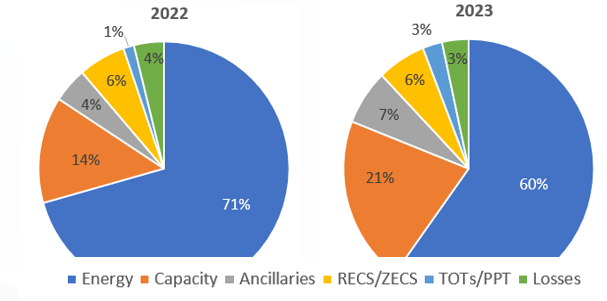 Caption: While energy (in blue) continues to be the principal driver of customer costs, capacity and ancillary services have become larger components of energy costs. Source: NYISO