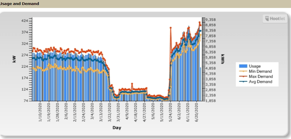 Bottom line for energy managers and finance professionals: The dynamics of the operational changes due to the pandemic shut down highlight the value of lowering peak energy demand. In addition, the complexity of current operational dynamics also suggest that customers could benefit from improved budgeting processes.